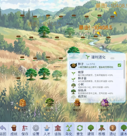 地图还会持续的扩大,从一棵小树慢慢的变成整片森林,还会有黄金树或者是闪电树。一旦在砍倒之后就可以获得稀有的资源,还能触发一个特殊的效果,例如冻结时间,还有全屏吸收资源,爽快感还是比较出色的。技能树系统是玩法的核心,你可以用木材去解锁各种强力的技能,例如增加资源掉落率,提升暴击率,还有解锁连锁砍伐。效率还是很不错的,后期还可以直接开启重生机制,可以重置当前所有的升级,用来去解锁更变态的终极技能,例如资源倍率暴涨,还有树木瞬间重生。