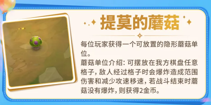 提莫的蘑菇给每个人一个可以放置的隐形蘑菇单位。蘑菇放在己方棋盘上,敌人经过时爆炸,造成范围伤害并降低攻速和移速。如果一整场战斗蘑菇都没爆,还能回2金币。这个效果不算特别强,但2金币的收益也不差,如果对面不走那一格的话白赚。摆放位置要结合对面可能的站位来判断,随便摆可能浪费。