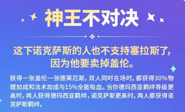 强化符文方面,神王不对决这个符文给了盖伦和德莱厄斯,两人同时在场就获得30%物理加成、法术加成和15%全能吸血,还能根据德玛西亚或诺克萨斯羁绊等级更高的一方给两人套上对应的羁绊。这种双核共存的设计比较少见,核心就是看哪边羁绊更好凑,然后往那个方向组队。