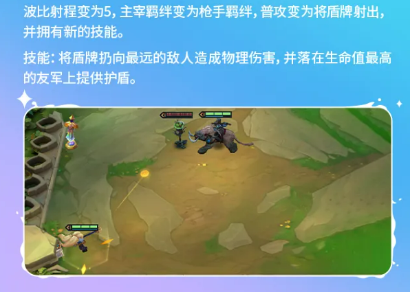 炮形态波比把波比的射程改成了5,主宰羁绊变成枪手羁绊,普攻变成把盾牌射出去,技能是扔向最远的敌人造成物理伤害,落点在生命值最高的友军上给一个护盾。波比变成远程枪手这个改动有点反差,但技能兼顾输出和保护,配合高血量的肉盾效果会比较明显。