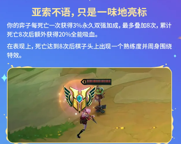 托儿索是一个死亡叠加型符文,每死一次获得3%永久双强加成,上限8次,叠满额外获得20%全能吸血,死亡8次后棋子头上还会出现特效。这个符文看起来是越死越强的路线,前期可以主动让棋子多消耗,把叠层尽量在中期补满,后期就会很暴力。