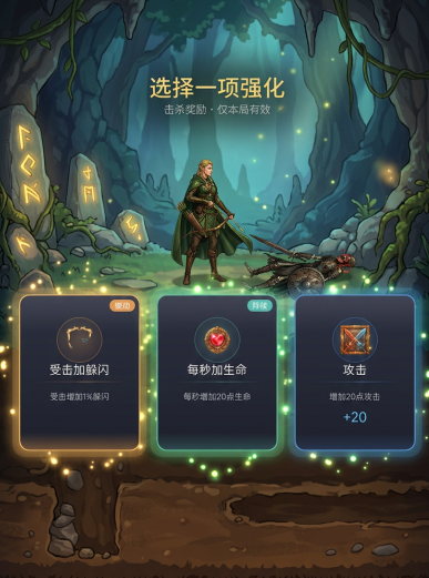 关卡的设计还是比较用心的,地形还有敌人的配置,确实会巧妙的结合在一起。养成系统就会让冒险充满乐趣,攻击,暴击,闪避,吸血等一系列属性就会自由的成长。每提升一级,每一次强化装备,大家都能感受到战斗力明显的提升。游戏里面还有很多的弓箭以及防具可以选择,例如普通的弓箭,还有火焰弓箭,每一个属性都并不一样。你可以根据战斗的风格去搭配,在打败敌人,完成关卡之后,就可以解锁强力的技能,例如穿透射击,还有万箭齐发。