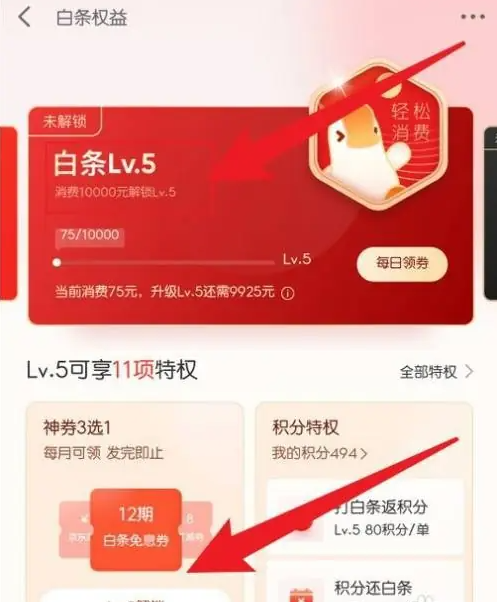 将白条等级提升到5级,就可以领取一张12期白条免息券。