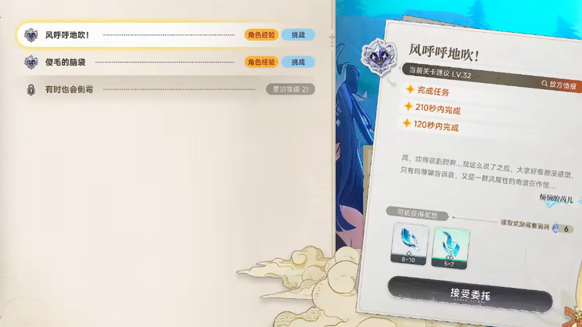 接取任务的时候,任务的难易程度是玩家必须要考虑的因素。每一个任务都有星级评定,难度为一星的任务一般会遇到低级的怪物,适合低练度的阵容去挑战;三星任务中出现的怪物会比较强,如果阵容不够强大,接受这样的任务就会遇到较大的困难。当玩家接到三星委托的时候,要特别注意任务中怪物的难度,如果觉得自己不能完成任务,可以拒绝接下任务,避免浪费任务星星数量,从而导致不能领取全部奖励。