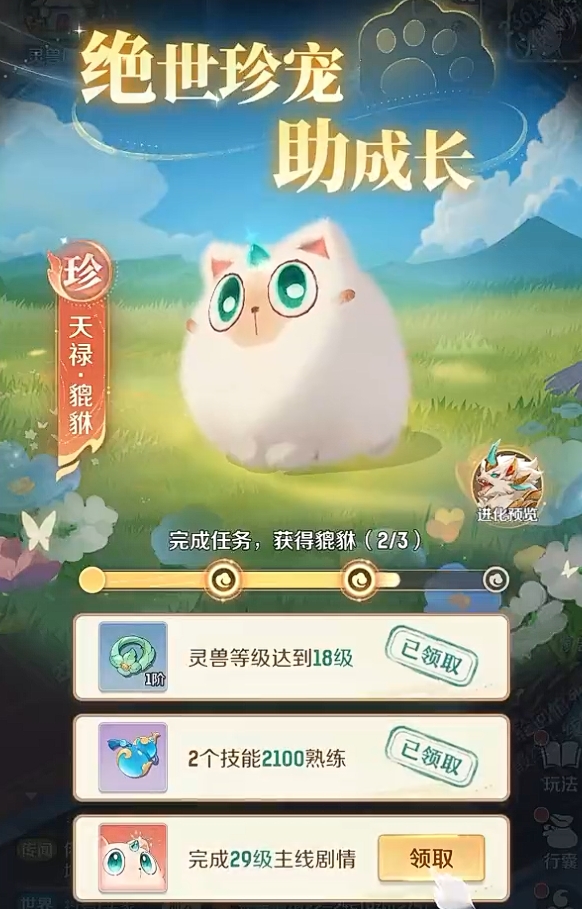 玩家们要想在游戏里获得貔貅也极为简单,在玩家初入游戏后会开启绝世珍宠助成长的活动,该活动分为三个阶段,当玩家们完成全部阶段的所有任务后,便能将貔貅领到手。这三个阶段的任务都非常好完成,玩家们只需随着主线正常游玩都能顺利做完,基本上不会被卡住。不过,玩家刚领到的貔貅还处于幼年期,还需投入资源将它尽快培养到成熟期,这样才能令貔貅在战斗中充分发挥自己的作战潜力,后续玩家还可为貔貅打技能书,比如高级神工鬼力、高级物暴等,令它变得更强大。