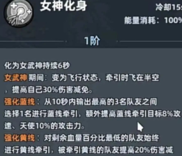 消耗百分百能量的女神化身,在化身的6秒内就会进入到飞行的状态。自身可以得到30%的伤害减免,在解锁强化效果之后,还能给目标提升8%的攻击速度,为自己提升10%的攻击力。黄线牵引就可以让队友能获得20%的伤害减免,同时天使每一秒还能恢复80%的攻击力,生命值可以让团队的作战能力更上一个台阶。在资源的培养上,天使的培养思路和那些高攻型的角色是不一样的,并不需要去追求极致的输出,而是应该优先的提升星级。同时还要推进等级的成长,保证关键技能可以迅速的升级。