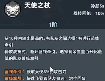 保留一点生命就可以进入到无敌的状态,三秒内马上就可以完成复活,还能恢复相当于天使900%攻击的生命值。在复活之后还有一秒无敌,堪称队友的第2条生命,在战局危急时,总是可以扭转乾坤。冷却只有5秒的天使之杖就是核心的治疗技能,并且还会有10的战斗技能回能。可以给天使提升8%的攻击力,在释放时就会切换为黄线牵引。锁定百分比最低的队友,就能迅速的恢复生命数值,实用性还是比较不错的。