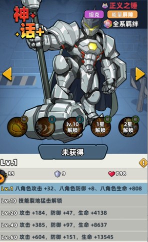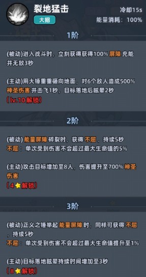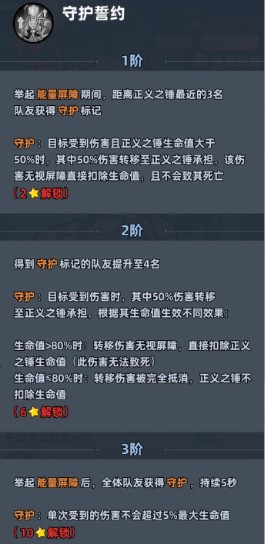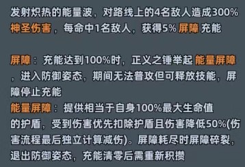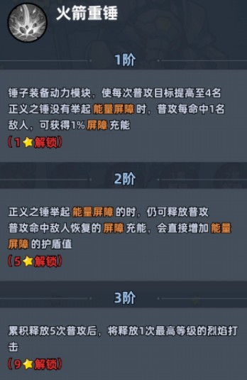 4、火箭重锤:每次普攻目标提升4名,命中1名敌人可以获得屏障充能。5星后会解锁正义之锤的最强形态,举起能量屏障可以释放普攻,并且会直接增加护盾值,等于可以无限护盾,当然要实战看看恢复情况。