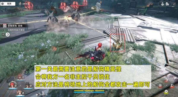 最需要注意的是船钩精英怪,会将我方一名非主控干员锁住,如果一段时间不破机制,这名干员还会直接退场;应对方法是将场地上的船钩全都攻击一遍即可。其余的敌人没有什么特殊机制,主要是考验队伍练度。