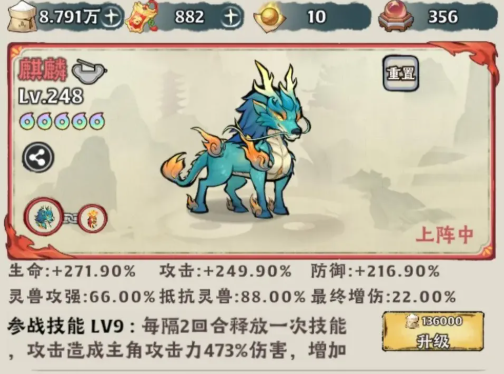 第二个为大家推荐的是平民玩家比较喜欢用的一个灵兽,叫做麒麟,麒麟如果在游戏当中有足够多的触发技能概率,那么在这里它是可以作为一类灵兽使用的,因为它在自身的技能效果当中有一个状态叫做弑神者,这个状态触发了之后,他自身的爆伤输出上面会得到150%的提升,而在自身的攻速效果上面会有30%的提升效果,后期搭配了金乌血脉的话,只要参与异兽挑战,在这里大家就可以打出非常高的输出,就算是1打5的情况下,他也有可能全身而退,所以玩儿麒麟的话,大家就要注意在这里,他如果状态提升的效果比较快,有好的时机他就可以带来更高的场内能力,在玩儿麒麟的时候,建议大家要找到比较适合的上场时机。