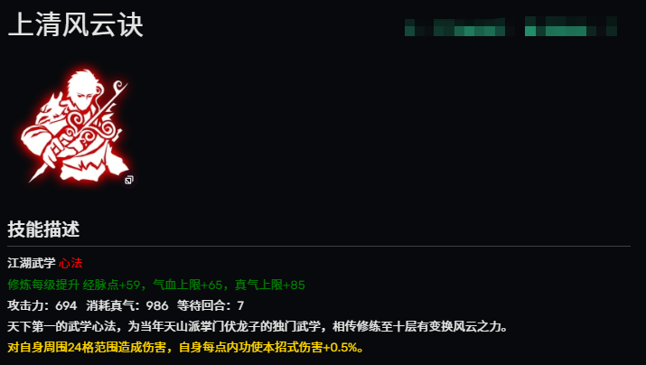 第一个为大家推荐的就是上清风云诀,上清风云诀目前给的技能效果确实是非常多的,在修炼等级提升上面,经脉点就给了59点,气血上面也给了65点,作为目前天下第一的武学功法。可以在使用之后,给自身的吸血增加到最高1300点的效果,而且根骨上面还可以额外增加5点,清除所有的负面效果之后,还可以给角色添加风起云涌的效果,这样的一个状态能力可以持续5个回合,还有50%的几率对目标造成1.2层的破招效果,后期风起云涌生效的时候,暴击概率会增加25%,然后集气的速度增加100%,这样的效果在期间每一个回合都会随机清除掉两个负面回合,所以在其中根本不会被对面给控制。