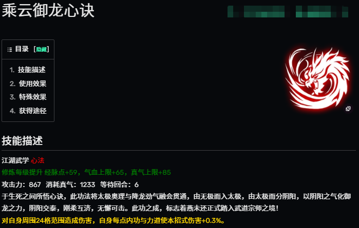 第三个大家可以学的是乘云御龙心决,这个功法当中也算是自带了两个金色的效果,所以用起来的话,两种增伤效果范围都比较有优势,他首先对自身周边24个的范围都可以造成伤害,而在内功以及力道效果上面,都可以让这一次的伤害数值上面增加0.3,使用之后还可以为自己增加一个擒龙的加成,另外有两层的太极效果,所以他这里增生的能力是有非常多的状态进行加成的,持续5个回合当中,擒龙就会让他命中增加30%,并且生效期间可以用任何丐帮招招式来进行输出,不过还有50%的概率会在一个回合里面用到集气减少15%的效果,太极这个状态的话每一层都会让他的伤害减免点增加,可以直接破掉敌人攻击,但是被敌人攻击的时候,这里还会返还本次伤害5%的数值给予对面的敌人,叠加到5层以后,这里的反击就非常强了。