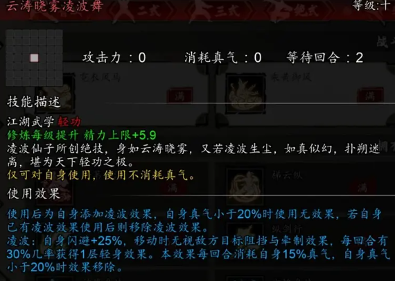 第四个大家可以玩的是云涛晓雾凌波舞,这个算是一类跟轻功有关的功法,在当中只能对自己使用,而且使用的话不消耗真气就可以用出来,用来玩儿连招是非常强的,在这里使用了之后,角色自身会有一个凌波效果的生成,只要是真气数值上面小于20%的话,用起来是没有什么效果的,所以只能在大于20%的情况下使用,如果他自身已经有凌波效果的话,那么这里可以除掉凌波效果,凌波可以给角色的斩灭概率增加25%,而且在移动的时候无视敌人的目标阻挡,还有一定的牵制能力,在这里也是直接无视的,每一个回合当中,大家都有30%的概率可以获得一层轻身的能力,如果每个回合都消耗了到15%的真气,那么这里真气小于20%的时候,这样的效果也会被移除掉。