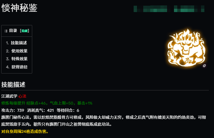 最后第五个就是为大家推荐的惔神秘鉴,这个功法当中大家可以对自身周围24格的位置都可以造成伤害,而且使用的话是不消耗真气的,在对战中使用了之后,每一次为自身带来的加成效果当中都有添加惔神的效果,持续4个回合,所以在其中每一个暴击的伤害都会增加15%之后还会攻击,然后触发一些暴击,那么对自身的惮神来说,是有根骨上面的属性加成效果,另外还有气血的加成,放在这里的也是非常好用的一类百搭功法。