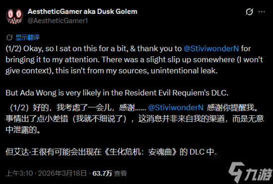 来自Dusk Golem的消息称,DLC将包含艾达与里昂,此前他还表示听说DLC会加入艾莉莎(格蕾丝养母)。