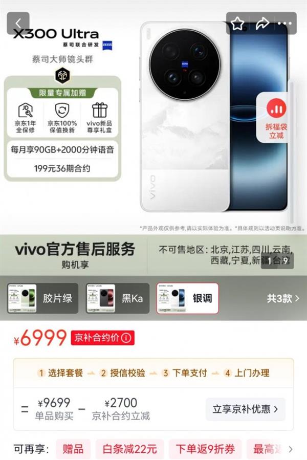 值得一提的是,部分地区消费者在京东可通过“京补合约”下单vivo X300 Ultra和vivo X300s,其中vivo X300 Ultra可选电信199元36期合约,每月可享90GB+2000分钟语音,vivo X300s可选电信99元36期合约,每月可享40GB+400分钟语音,均限量加赠京东1年全保修、京东100%保值换新、vivo新品尊享礼盒。