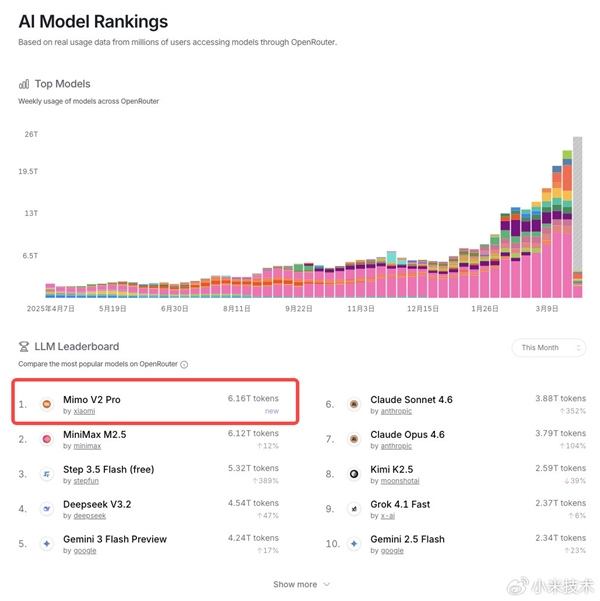 最新数据显示,其单周token消耗量突破4.19万亿,上线不足半个月,月累计token消耗量已达6.16万亿,远超同期其他全球顶尖大模型,持续蝉联榜单榜首。