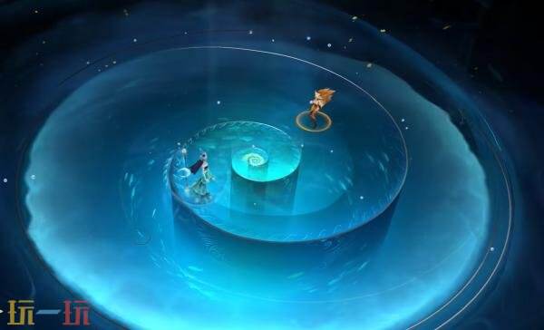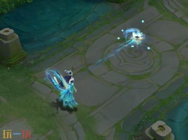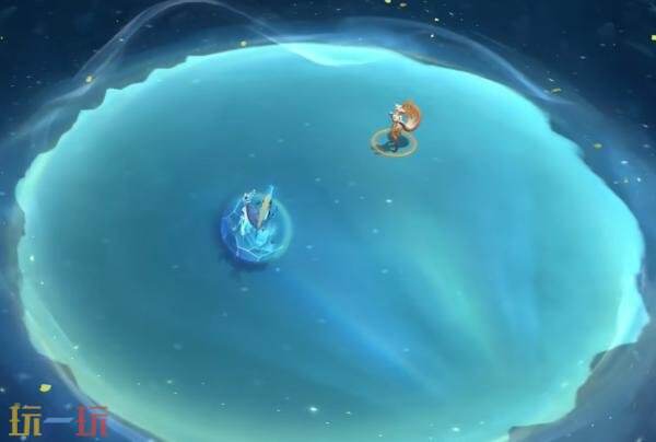 三技能:水母以海水为媒介,碧波荡漾间,将目标引入深海幻境。螺旋转动的幻境中透着幽幽微光,花瓣粒子点点,鱼群环绕,静谧而幽深。