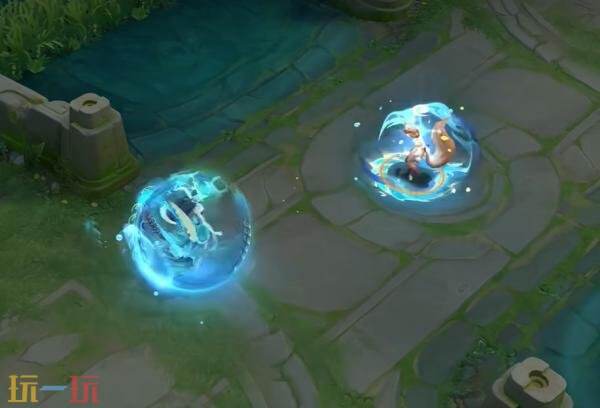 二技能:裹挟海水的珍珠、贝壳、海螺相继释出,护盾则如水幕包裹,波光流转其中。