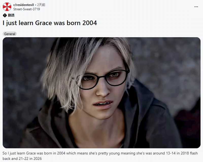 近日国外Reddit论坛有网友发帖称,他发现《生化危机9》女主格蕾丝于2004年出生,2018年闪回中她是13-14岁,2026年则是21-22岁。