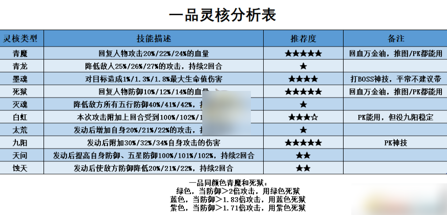 目前一品灵核有三种品阶:绿色,蓝色,紫色,品阶越高技能效果越好