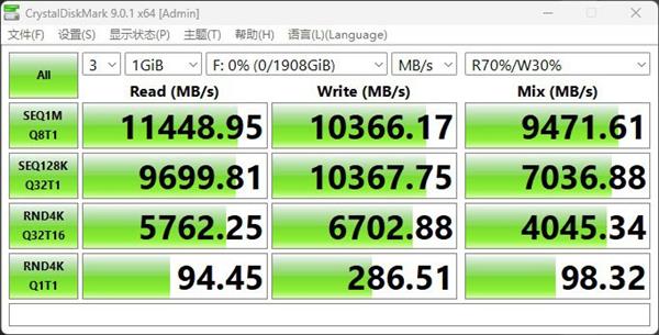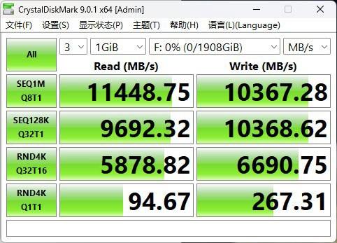在CrystalDiskMark速度测试中,该款SSD的性能表现也是非常亮眼。连续读取速度达到11448MB/s,写入速度也有10367MB/s,均超过标称速度。