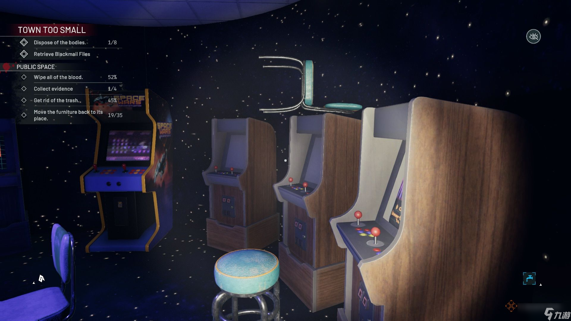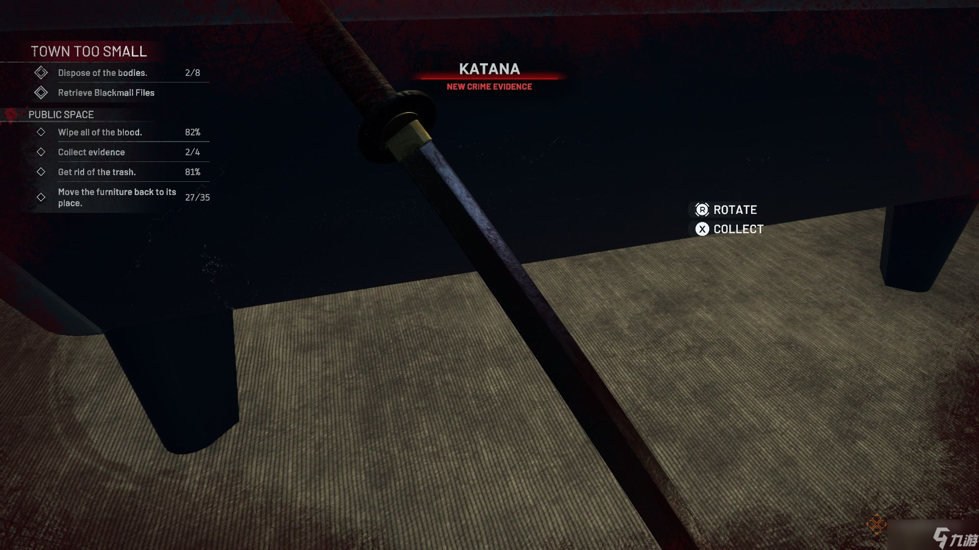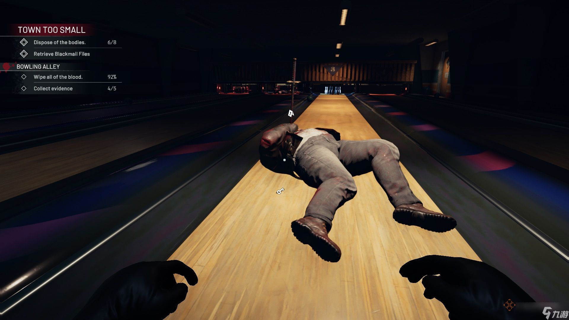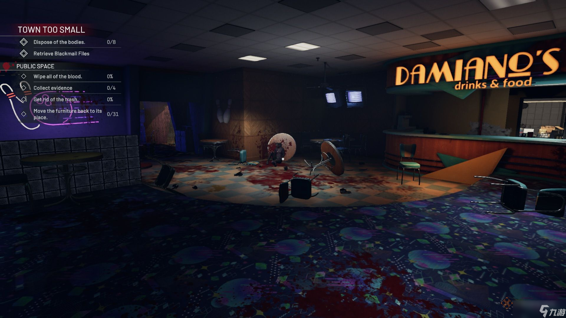 前往有街机的区域,清理并找到桌上的录音(证据)。桌上足球和台球桌区域有一具尸体需要清理,尸体上插着一根桌上足球杆(证据),其中一张台球桌下还插着一把武士刀(证据)。