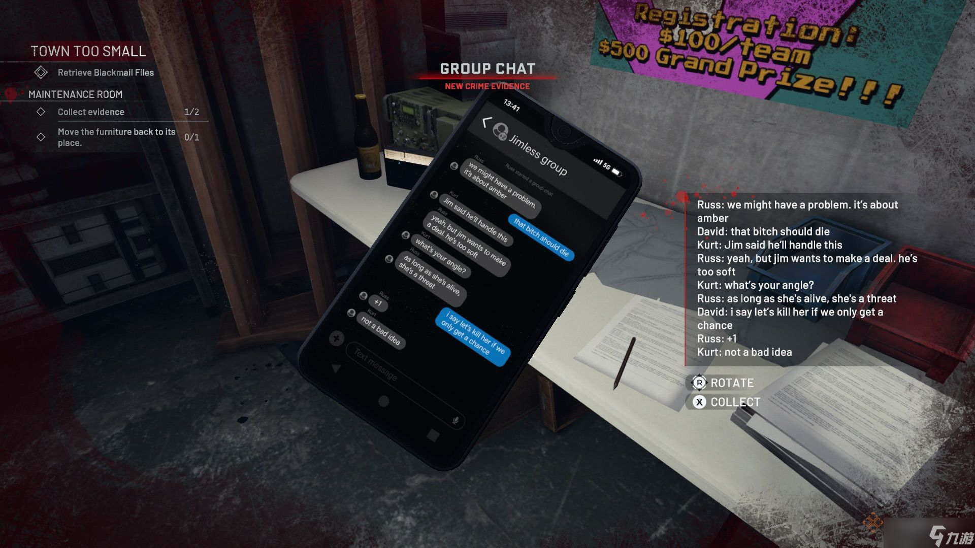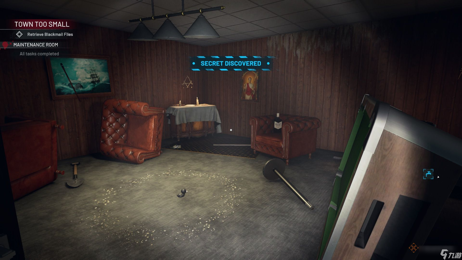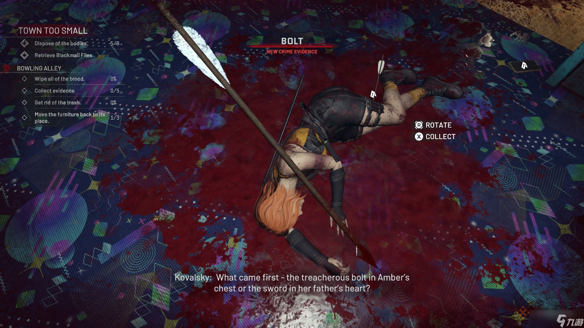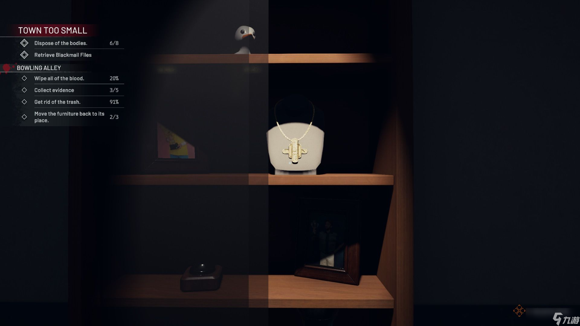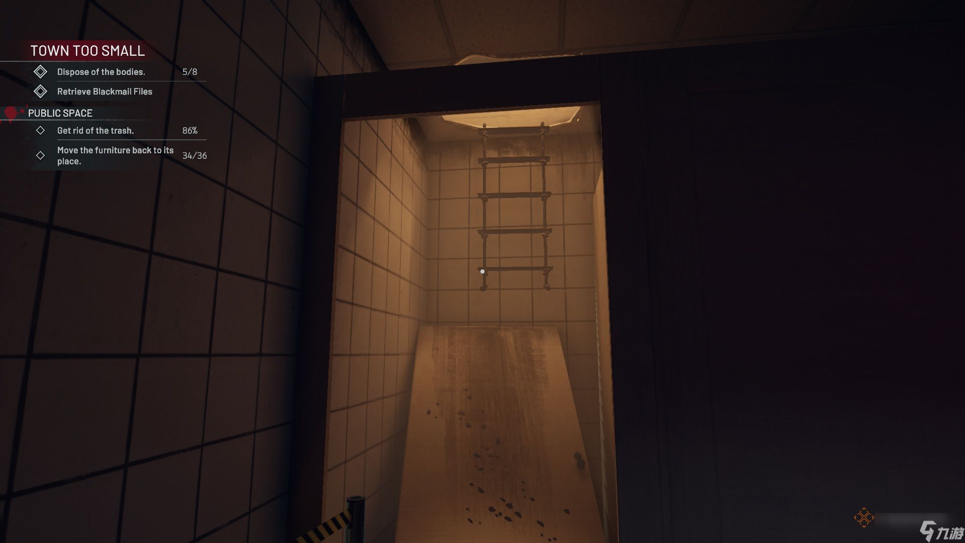 前往有街机的区域,清理并找到桌上的录音(证据)。桌上足球和台球桌区域有一具尸体需要清理,尸体上插着一根桌上足球杆(证据),其中一张台球桌下还插着一把武士刀(证据)。