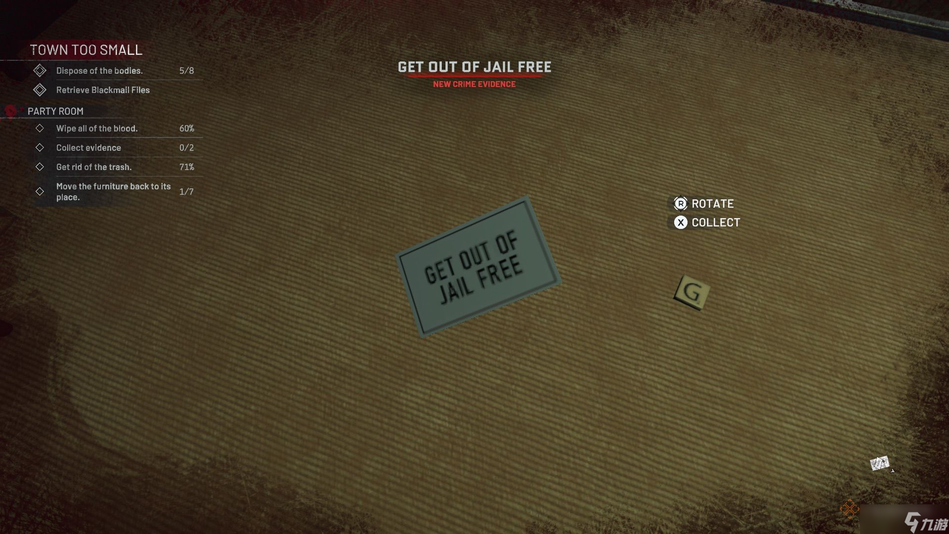 派对室里有两具尸体和许多破损的家具。移走尸体,开始清理破损的椅子,然后拖地清除血迹。柜子下面的地板上有一张“免入狱”卡(证据)。