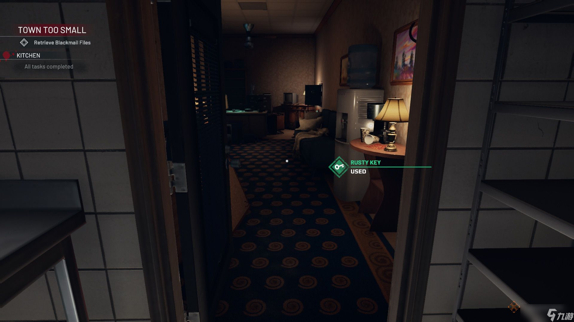 返回公共区域并进入厨房。使用生锈的钥匙打开右侧的办公室门。里面有垃圾需要拾取,还有一把椅子要归位。