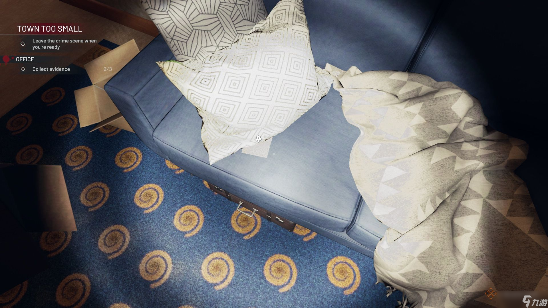 拾取桌上的文件(证据),以及保险箱里的现金。蓝色沙发上,一个靠垫下还有一张明信片(证据)。