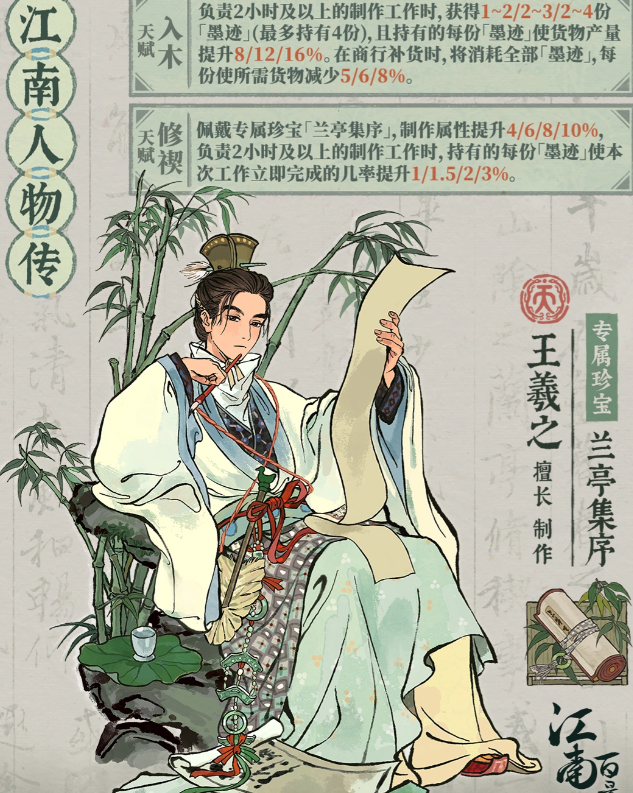 江南百景的游戏介绍简单就说到这里,接下来小编带大家了解游戏中的新角色王羲之解析。王羲之是一位天级文化型辅助角色,他的核心玩法是围绕墨迹来展开的,通过长周期的积攒墨迹从而获取产量和资源的减免。