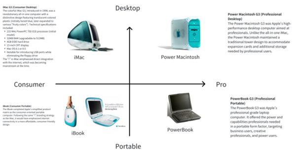 当时苹果有几十个电脑型号,乔布斯把工程师叫到一起,在黑板上画了一个简单的四格矩阵,分别是消费级、专业级;台式、便携;他说:“ 我们只需要做这四种电脑 ”。