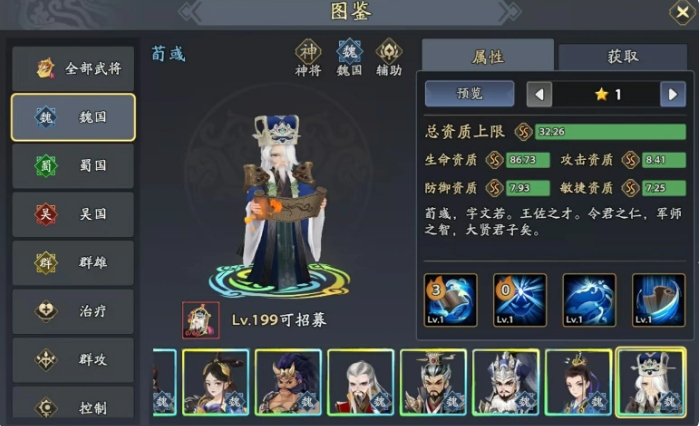 其被动“刚烈”为夏侯惇提供了关键的状态抗性成长路径。当体力属性提升后,“刚烈”可同步激活高额生命值与防御力加成,进一步放大其前排承伤能力。因此,在属性培养上建议优先堆叠体力,以最大化被动收益。在此基础上,阵容配置应侧重补充稳定输出与功能性辅助——张辽与曹操构成主力输出轴:张辽专注单体高伤与自疗续航,曹操则凭借群攻技能与敏捷属性保障出手顺序与AOE覆盖率;郭嘉负责群体微疗与异常状态拦截,有效应对敌方控制链;荀彧则承担节奏干扰职能,通过随机双目标攻击与怒气获取削减,打乱对手技能释放节奏。