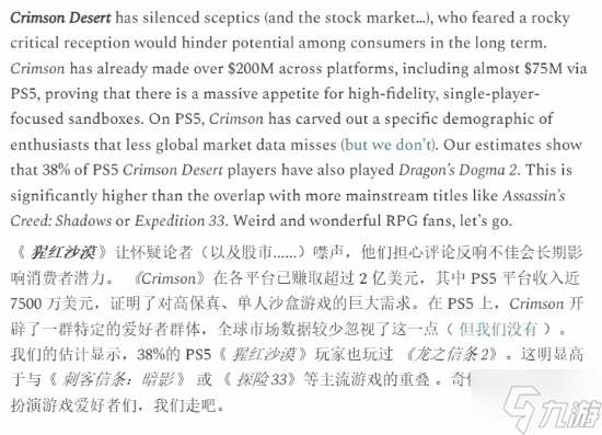 《红色沙漠》上线还不到两周,销量就已经冲到了400万份,营收表现更是直接拉满。Alinea Analytics市场分析主管Rhys Elliott透露,这款开放世界动作冒险游戏,目前全平台总营收已经突破2亿美元,其中PS5平台的贡献格外抢眼,单平台就狂揽7500万美元。