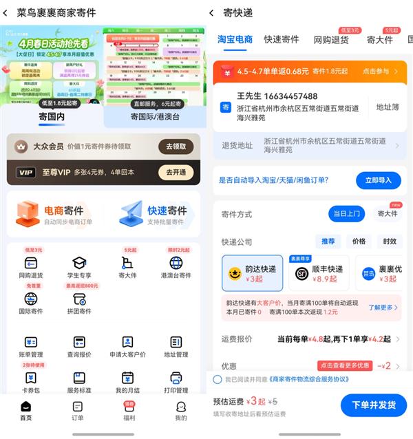 · 发货也是个麻烦事?现在千牛里直接集成了菜鸟裹裹寄件功能,商家不用在手机里来回切换,点几下就能完成下单,等着快递员上门就行,省心又省力。