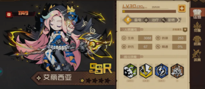 另外大家在阵容当中如果觉得自己没有足够多的承担伤害能力,在这里也可以放一个艾丽西亚来保险,她的话就要难拿很多,因为是一个SSR品质的角色,当然她的雷属性效果当中,除了基础的治疗之外,武器的续航同样也可以通过大招来提升,大招能力里面为全体的队友都可以带来一个及时的回血,另外被动能力上面额外触发之后,对于增加一名目标的之后的治疗量也是比较高的,如果我方已经打到后期的话,那么全员血量都有下降的时候,这里通过她就可以实现一个高效抬血的功能,另外艾丽西亚在各方面属性搭配上面其实兼容性也比较强,所以,对于队伍其他的成员没有那么高的限制,用在一些特定的队伍来构成整体搭配的话,也是可以放在奶妈位置上面的,所以相对其他的治疗角色来说,艾丽西亚对于这个阵容的适配性也是比较高的,放在整体阵容当中可以延长大家的作战时间。