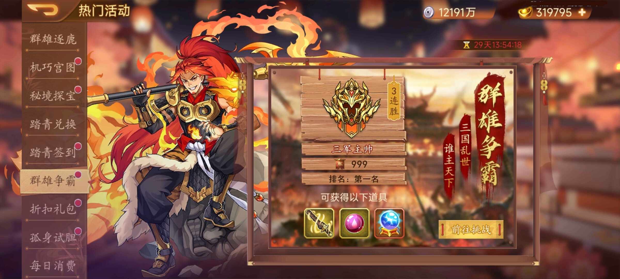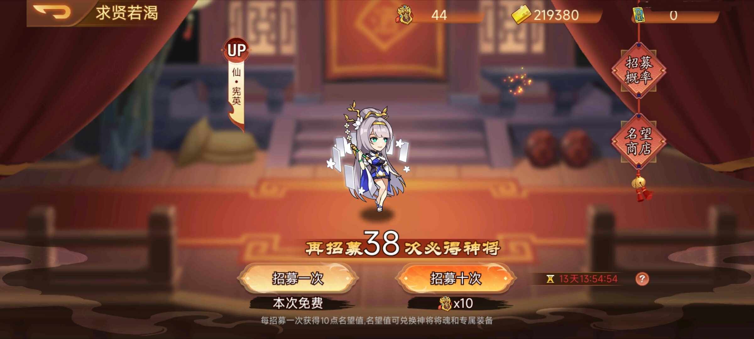 活动内容:活动期间,可通过消耗招募令进行招募武将,up武将的概率会高于其他同档位武将(每期活动会更换up武将),每次招募可获得10名望,名望可在名望商店兑换道具。