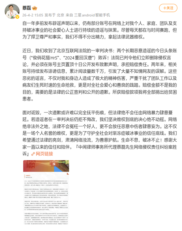 面对胜诉结果,蔡磊表示,维权的核心目的并非获取赔偿,而是捍卫事实与尊严,希望通过此次判决明确网络并非法外之地,也为公益人士维权提供参考。