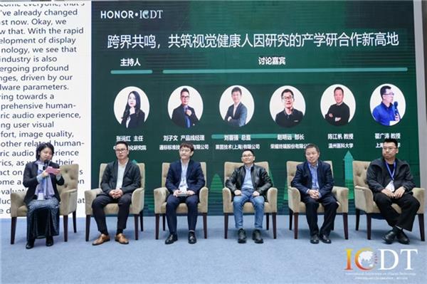 在论坛备受瞩目的压轴环节,一场聚焦行业现状与未来的深度对话正式展开。荣耀显示音频负责人赵明远,与来自温州医科大学、上海交通大学,以及莱茵、SGS的相关负责人同台论道。嘉宾们不仅深入探讨了当前人因研究在显示领域面临的现实挑战与破局之道,更在现场联合发布了“聚力人因·共护视界”的行业倡议: