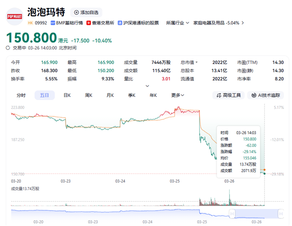 短短两天时间,股价暴跌了 30%。市场不仅没买账,还给了泡泡玛特一记毒打。