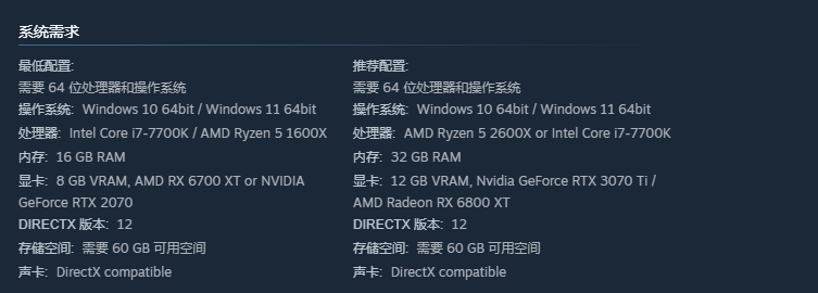 与此前试玩版的最低配置(Intel Core i5-4690K / AMD FX-8320、Nvidia GTX 970 / AMD RX 480、8GB内存、5GB存储)相比,各项指标均有明显提升。