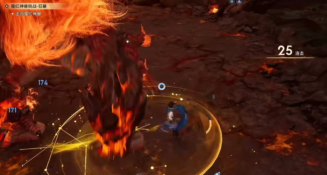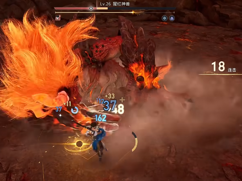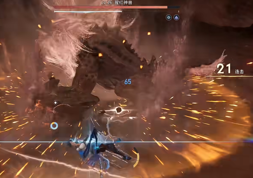 以猩红神兽为例:该Boss存在明确弱点部位——尾部。持续攻击尾部约3秒后,其将发动下压式熔浆喷发,此时立即触发闪避,可进入短暂无敌状态(视觉表现为全身闪光),随后接续黄金回旋贴近并爆发输出,既保障生存,又维持连击数稳定增长。