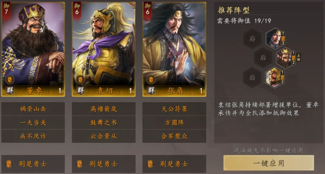 说一下这套阵容的打法思路。董卓放主将位,搭配方圆阵,每回合开始,他都能先手削对方的统帅值,同时给己方加属性,还会附上抵御状态。抵御这个效果,对召唤物来说特别重要,因为召唤物血量本来就不高,有了抵御相当于多撑一轮。鼓舞之书加上云和景从,可以在回合中补血补防,董卓给的抵御被打掉之后,云和景从还能后手再补一层,每回合结束时,鼓舞之书还会给全队回血,整体续航能力很强。
