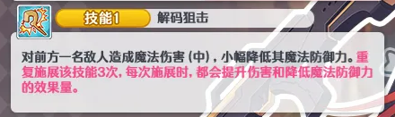 她的一技能也很有用。这个技能,会先对前面一名敌人,造成中等魔法伤害,同时压低对方的魔法防御。重点在后面,这个技能会连续施放三次,而且不是三次都一样。每多放一次,伤害就会更高,降低魔防的效果也会更明显。这样的设计,很适合对付前排较硬的目标,特别是在队伍本来就靠法伤,打穿对面的情况下,这个技能,等于先帮队友把门推开,再让后面的输出跟上。