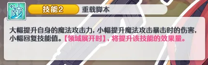 二技能,是她维持强度的另一块拼图。这个技能,会先大幅提高自己的魔法攻击力,再小幅提升魔法暴击时的伤害,同时还会回复一些技能值。对一个靠连结爆发带队的人来说,技能值回复很重要,因为这代表她能更快转起来。更重要的是,当领域已经展开时,这个技能的效果还会变强。也就是说,她的技能和连结爆发之间,不是分开的,而是一环接一环。开出领域后,她自己会更强,之后的输出和循环也会更顺,这种自我推进能力,让她在长一点的战斗里,表现更亮眼。