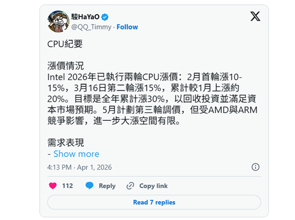 4月3日消息,2026年开年仅三个月,Intel就已连续落地两轮消费级CPU涨价,全年累计涨幅最高将冲击30%。