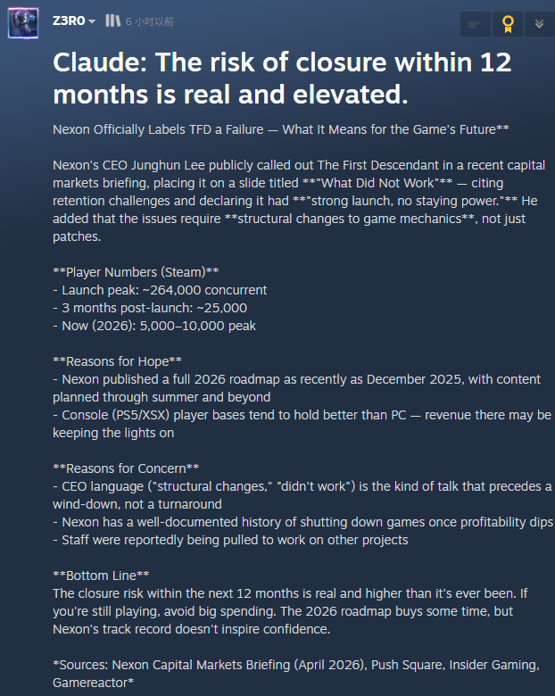 玩家自发利用现代技术进行了调查,使用人工智能Claude 对当前项目状况及受众兴趣下降趋势进行了分析。AI的计算结果不容乐观:根据其结论,《第一后裔》将在未来12个月内完全关服。