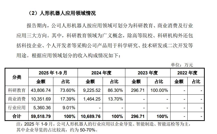 另一边,宇树在上市问询函的回复中还提到,公司目前人形机器人产品应用领域还是以教育科研为主。这代表着,从宇树的视角看,人形机器人的真实使用场景可能没有市面上那么乐观,机器人表演、进厂打工、商业导览等用途,还不是主流需求。