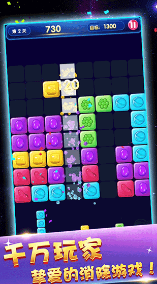 主打色彩表现与视听沉浸感,每个方块单元均具备独立色相与光泽质感,消除动画采用粒子迸发+流光拖尾效果。创新组合消除机制允许玩家主动拼接特定形状达成多行同步清除,配合一键释放型道具,大幅降低上手门槛。操作逻辑精简至三键响应,适配碎片化时间快速开局与高强度短时对抗。